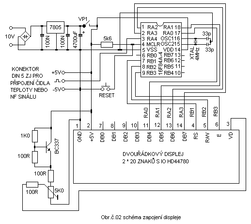 napětí 5V již napájí procesor 16F84A/04 a při použití dvouřádkového znakového