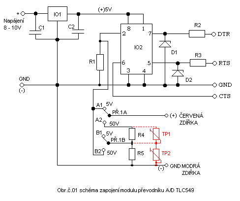 Modul je vlastně převodník A/D jde v mém případě o oblíbený a osvědčený integrovaný obvod TLC549 což je osmibitový A/D převodník modul se připojuje na sériový port nebo pomocí redukce USB/COM k počítači osobně ho používám spíše takto s redukcí USB/COM.Napájení tohoto modulu je v terénu možné z devítivoltové baterie nebo ze síťového zdroje jehož napětí nesmí být nižší jak 8VDC,modul má stabilizátor napětí na hodnotu 5V které je současně jak napájecí tak je použito jako referenční napětí pro A/D převodník tím je dána jeho rozlišovací schopnost 5/255= 0.0196V zaokrouhleno je pak 0.02V.Modul umožňuje měřit na dvou rozsazích první rozsah je od 0V do maximálně 5VDC a druhý rozsah umožňuje měřit napětí také od 0V do 50VDC volba rozsahů se provádí přepínačem PŘ.1.Na modulu jsou dvě zdířky modrá a červená, do modré zdířky se připojuje záporný pól od testovaných zdrojů (baterií a podobně), do červené zdířky se připojuje kladný pól od testovaných zdrojů (baterií a podobně). Kladné napětí připojené do červené zdířky je připojeno na střední vývod přepínače PŘ.1A tímto přepínačem volíme rozsah 0 – 5V nebo 0 – 50V a dále je pak z tohoto přepínače dle volby rozsahu připojeno na vstup IO2. Za zmínku tohoto triviálního zapojení převodníku stojí bočník složený z rezistorů označených ve schématu R4 a R5,na těchto přesných hodnotách záleží při měření napětí na rozsahu 50VDC naměřená hodnota A/D převodníku, proto jsou ve schématu naznačeny trimry TP1 a TP2 kterými nahradíme, pokud chceme rezistory R4 a R5 a na trimrech nastavíme hodnoty, jenž mají R4 a R5 tím je nastavení bočníku pro měření na rozsahu 50VDC hotovo. Schéma zapojení převodníku je na obrázku č. 01.