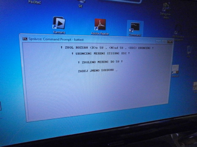Program BATTEST.EXE slouží k měření napětí na testovaném zdroji a pro zobrazení hodnot na monitoru PC dle zadané volby odečtu mezi zápisy. Volba připojení modulu k PC na sériový port je shodná s programem DMM.EXE po volbě portu se zobrazí, zvol rozsah měření do 5V nad 5V tuto volbu volíme stejně jako u programu DMM.EXE. tj. měřit napětí do 5V tuto volbu volíme stiskem klávesy D nebo zda budeme měřit napětí nad 5V tuto volbu zvolíme stiskem klávesy N. Po volbě rozsahu se zobrazí zadej jméno souboru zde zadáváme jméno souboru (zadáváme maximálně osm znaků bez diakritiky) kam se budou zapisovat naměřené hodnoty po zadání jména souboru stiskneme klávesu ENTER. Zobrazí se další zadání zadej dobu zápisu v milisekundách zde máme možnost zadat hodnotu v rozsahu od 10milisekund až do několika minut, po zadání hodnoty stiskneme klávesu ENTER a program již provádí měření do doby, než stiskneme klávesu ESC. Po stisku klávesy ESC se program ukončí a v adresáři kde je program BATTEST.EXE je i soubor se zadaným jménem kde jsou uloženy naměřené hodnoty tyto jsou uloženy tak že na každém řádku je vždy deset naměřených hodnot tuto volbu jsem zvolil pro lepší přehled naměřených hodnot.