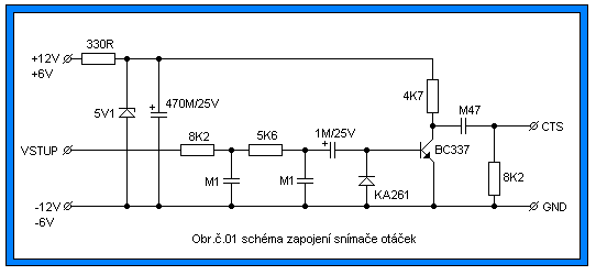 Přípravek jehož schéma je na obr.č.01 je napájen z palubní sítě automobilu vstupní napětí je stabilizováno ZENEROVOU DIODOU na hodnotu napětí 5.1V které již napájí přípravek. Vstupní signál od přerušovače je filtrován rezistory a kondenzátory takto filtrovaný signál pak již spíná tranzistor. V kolektoru tranzistoru je zapojený rezistor a oddělovací kondenzátor pro vstup signálu do počítače, počítač snímá signál na vstupu CTS, zapojení je velice jednoduché. DPS přípravku (univerzální vrtaná destička) na měření otáček je umístěna do krabičky společně s DPS na měření úhlu sepnutí kontaktů rozdělovače a měření napětí palubní sítě.