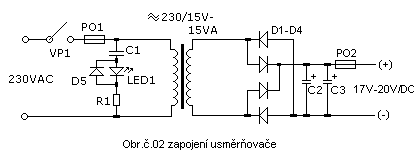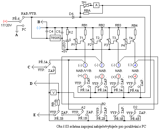 Nabíječka je napájena ze zdroje který tvoří transformátor jehož volba je čistě individuální dle potřebných nabíjecích proudů,tento je na primární straně jištěný pojistkou PO1 a zapnutí je signalizováno led diodou D1.Sekundární napětí je usměrněno diodovým můstkem vyhlazeno kondenzátory C1,C2 a výstup stejnosměrného napětí je jištěno pojistkou PO2 schéma zapojení zdroje je na obrázku č.02.Schéma zapojení nabíječky je na obrázku č.01 usměrněné napětí je připojeno na stabilizátor 78S05 který stabilizuje napětí na hodnotu 5V a toto napětí je signalizováno led diodou D2 pro nastavování nabíjecího proudu tento se nastavuje pomocí potenciometrů P1 až P4 které ovládají báze tranzistorů T1 až T4.Kladné napětí ze zdroje je dále připojeno na anodu diody D6 tato zabraňuje vybíjení nabíjené baterie při náhodném výpadku el.proudu při nabíjení baterií z katody diody D6 je kladné napětí přivedeno na jedny krajní vývody přepínačů označených PŘ.1A až PŘ.4A.Současně je kladné napětí z katody D6 připojeno přes ampérmetr na druhé krajní vývody přepínačů označených PŘ.1A až PŘ.4A takto zapojené přepínače umožňují nastavení nabíjecího proudu u každé nabíjené baterie zvlášť,současně je připojen na tuto větev i voltmetr.Střední vývody přepínačů PŘ.1A až PŘ.4A jsou připojeny na červené zdířky označené ve schématu červeně 1,2,3,4 jsem se připojují kladné vývody z nabíjených baterií.Záporný napájecí pól (-) je připojen z kolektorů T1 až T4 na černé zdířky označené ve schématu modře 1,2,3,4 jsem s připojují záporná napětí z nabíjených baterií současně je z těchto zdířek provedeno připojení středních vývodů přepínačů označených PŘ.2B až PŘ.4B které pokud jsou přepnuty do pracovních poloh připojují druhý vývod voltmetru na záporný pól napájení (-).Ze zdířek označených NAB/VYB je vyvedeno propojení na přepínač označený PŘ.5A a PŘ.5B (TENTO DOPORUČUJI OZNAČIT JAKO TEST BATERIE) pro vybíjení připojené baterie přepnutím tohoto přepínače do pracovní polohy ZAP a připojením baterie je tato vybíjena přes vybíjecí rezistor označený RB.VYB hodnota tohoto rezistoru ovlivňuje vybíjecí proud daný napětím vybíjené baterie PŘI VYBÍJENÍ BATERIE BEZ POČÍTAČE SE MUSÍ ZAJISTIT TO ABY NEDOŠLO K NADMĚRNÉMU VYBITÍ PŘIPOJENÉ BATERIE,toto vybíjení před nabíjením je vhodné pro baterie nabíjené převážně v rychlonabíječkách.Velikost nabíjecího proudu se nastavuje pomocí potenciometrů P1 až P4 které ovládají báze tranzistorů T1 až T4 jde o DARLONGTONOVY TRANZISTORY jež mají v emitorech zapojeny rezistory označené RB1 až RB4 (REZISTORY označené RB.VYB a RB1 až RB4 jsou složeny ze dvou rezistorů zapojených paralelně) tyto jsou pak připojeny na záporný pól napájení tyto rezistory ovlivňují velikost nabíjecího proudu.Rezistory označené RBA a TP1 jsou součástí ampérmetru.