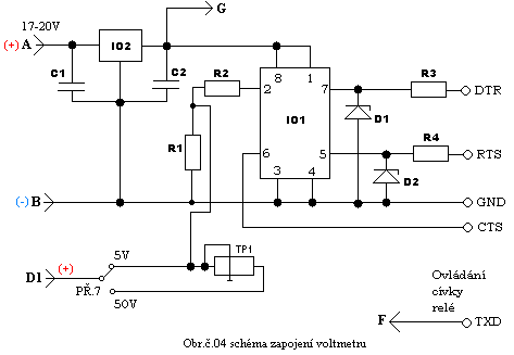 Modul voltmetru je umístěn ve společné krabici nabíječky/vybíječky a je napájen ze společného zdroje nabíječky/vybíječky s počítačem je propojen kabelem na použité vstupy/výstupy sériového portu,je možné modul voltmetru udělat do samostatné krabičky a s nabíječkou/vybíječkou provést propojení pomocí vícežilového kabelu..Voltmetr je tvořen jedním integrovaným obvodem TLC549 jedná se o osmibitový A/D převodník ovládání převodníku zajišťuje počítač výstupy DTR a RTS,výstup DTR je připojen přes rezistor R3 a stabilizační diodu D1 na vstup č.7 CLK IO TLC549.Dioda D1 upravuje vstupní napětí z vývodu DTR na napětí do 5V,rezistor R3 omezuje proud tekoucí diodou D1.Výstup RTS je připojen přes rezistor R4 a stabilizační diodu D2 na vstup č.5 CS IO TLC549,tento vstup přepíná mezi režimy čtení a převodu,rezistor R4 a dioda D2 má stejnou funkci jako rezistor R3 a dioda D1.Měřené napětí je snímáno počítačem na vstupu CTS,vstup kladného referenčního napětí na vývodu č.1 IO TLC549 je spojen vývodem č.8 na napájecí napětí(+5V),záporné referenční napětí na vývodu č.3 IO TLC549 je spojen s vývodem č.4 a připojen na záporné napájecí napětí (-5V),tímto je dána i rozlišovací schopnost IO TLC549 a ta je 0.02V.Převodník je napájen stabilizovaným napětím 5V toto napětí je stabilizováno IO MAA7805.Vstup měřeného napětí na A/D je veden na přepínač kterým se přepínají rozsahy 0 až 5V= a rozsah 0 až 50V=,při rozsahu do 5V je vstupní napětí přivedeno z přepínače na vstup IO č.2 přes rezistory R1 a R2.Při rozsahu 0 až 50V je měřené napětí přivedeno z přepínače rozsahů na trim TP1 a z něho na rezistor R1.Trim TP1 s rezistorem R1 tvoří při rozsahu 0 až 50V napěťový dělič,z tohoto děliče je měřené napětí přivedeno na rezistor R2 a z něho na vstup č.2 IO TLC549.Schéma zapojení voltmetru je na obrázku č.04