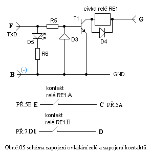 TXD z počítače a tím i zapnutí relé RE1 je tvořena rezistorem R6 a led diodou