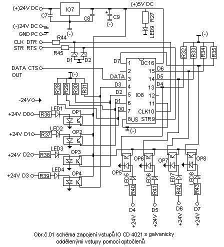 Schéma zapojení převodníku je na obrázku č.01 napájení je možné napětím od 12VDC do 24VDC které je stabilizováno IO7 což je stabilizátor 7805 na napětí 5V toto napětí již napájí integrovaný obvod CD4021 a signalizační led D9 dále napájí tranzistory v optočlenech OP1 až OP8 které oddělují vstupy CD4021.Led diody v optočlenech OP1 až OP8 jsou led diodami D1 až D8 a rezistory R36 až R43 napájeny napětím (+24)V,(-24)V je připojeno na svorku označenou -24V se šipkou toto napětí 24VDC je z jiného zdroje než je zdroj 24VDC napájející stabilizátor IO7 a elektroniku převodníku.Napájení převodníku si každý uzpůsobí podle vlastních potřeb,stejně tak napájení vstupů D0 až D7 CD4021 kde nemusí použít optočleny.Řídící vstupy z počítače které ovládají vstupy CD4021 CLK a STR jsou stabilizovány na napětí 4.7V zenerovými diodami D1 a D2 společně s rezistory R44 a R45.Řřídící vstup CLK integrovaného obvodu CD4021 je připojen na výstup DTR sériového portu PC,řídící vstup STR integrovaného obvodu CD4021 je připojen na výstup RTS sériového portu PC.Načtená data z CD4021 jsou čtena na vstupu CTS sériového portu počítače PC.