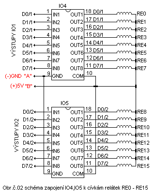 Přípravek i cívky relátek jsou napájeny z integrovaného obvodu IO1 což je stabilizátor 78T05 tento byl zvolen z důvodu použití relátek na napětí 5V DC integrovaný obvod má použity blokovací kondenzátory C1,C2 o hodnotě 100nF,kondenzátor označený C3 je elektrolytický filtrační a má hodnotu 2200uF/10V .Napájení přípravku je ze zdroje o napětí 9VDC a proudu 2.5A,stabilizované napětí 5VDC již napájí integrované obvody IO2,IO3,IO4,IO5 a cívky relátek,signalizace zapnutého přípravku je signalizována svitem led diody D1 rezistor R4 omezuje proud tekoucí led diodou D1 tím se jeho hodnota bude lišit dle proudu použité led diody a je nutné si jí vypočítat což je triviální věc.Integrované obvody označené IO2,IO3 jsou typu 4094 jde o posuvné registry které s ovládají pomocí výstupů sériového portu DTR,RTS,TXD řídícím počítačem,výstupní signály počítače jsou na potřebné napětí vstupů 4094 upraveny pomocí zenerových diod D1,D2,D3 tyto jsou typu BZX55/4.7 a rezistorů R1,R2,R3 tyto mají hodnotu 10K.Integrované obvody IO2,IO3 svými výstupy D0 až D7 ovládají vstupy integrovaných obvodů IO4,IO5 což jsou tranzistorová pole typu ULN2803A,tyto IO již spínají cívky uvedených relátek.Pokud se použijí relátka jejichž cívka je na jiné napětí než 5VDC přeruší se napájení +5VDC a na cívky relátek se připojí vyšší napájecí napětí dle napětí cívek relátek.Při použití uvedených IO ULN2803A se musí brát zřetel na proud cívky použitého relátka jeden výstup ULN2803A snese MAXIMÁLNĚ PROUD 0.5A při provozu je lepší používat cívku relátka jejichž proud nepřesáhne 0.25A MAXIMÁLNĚ.Schéma zapojení přípravku je na obrázcích č.01 a č.02.pro použité integrované obvody je vhodné použít patice pro snadnou výměnu nebo při použití uvedených IO v jiných aplikacích.