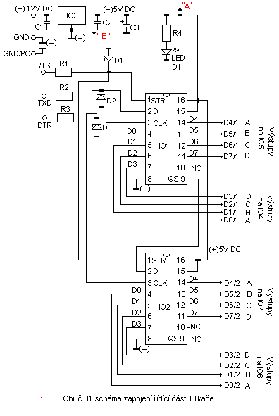 Napájení přípravku je napětím 12VDC ze zdroje který je schopen dát 1.5A odběr přípravku nepřevyšuje 0.5A.Toto napětí je upraveno stabilizátorem IO3 7805 na hodnotu 5V které napájí celý přípravek včetně led diod v maticovém displeji.Ovládání převodníků kódu BCD na 1 ze 16 které tvoří IO4,IO5,IO6,IO7 což jsou 74LS154 je použito integrovaných obvodů IO1 a IO2 CD4094 což jsou sérioparalelní posuvné registry.Řídící výstupy DTR,RTS,TXT z počítače PC jsou upraveny Zenerovými diodami D1,D2,D3 a rezistory R1,R2,R3 na vhodnou napěťovou úroveň vstupů IO1 a IO2 celkové schéma zapojení přípravku je na obrázcích č.01,č.02A,č.02B.Omezovací rezistory R5,R6,R7,R8 u každého převodníku BCD pro šestnáct led diod nastavují protékající proud dle proudu použitých led diod v tomto zapojení jsou použity led diody 2V/0.002A a proud je omezen na 0.0015A.Integrovaný obvod IO1 ovládá dva převodníky IO4 a IO5 kódu BCD 1ze 16,integrovaný obvod IO2 ovládá dva převodníky IO6 a IO7 kódu BCD 1 ze 16.