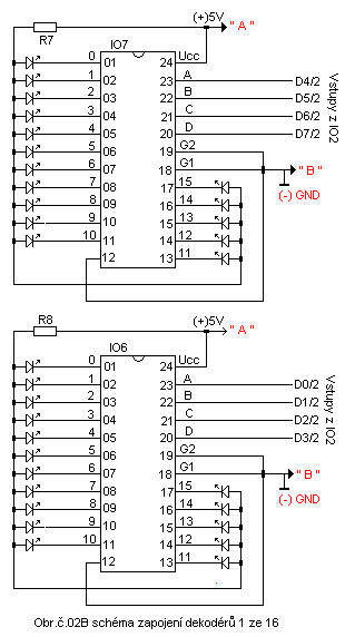 Na obrázku č.03 je rozkreslení maticového displeje po 4*4 led diod = 16,pro čtyři převodníky BCD kódu 1ze 16.