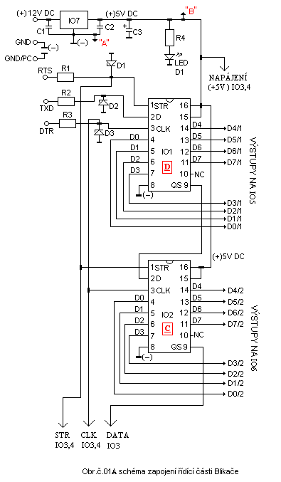 Posuvné registry jsou označené IO1“D“,IO2“C“,IO3“B“,IO4“A“ řízení posuvných registrů ze strany PC je pomocí výstupních linek sériového portu RTS,TXD,DTR,jako první se v programu zadává hodnota za „A“ pak za „B“ za „C“ a nakonec za „D“.Zadá hodnota za „A“ tato je poslána na poslední IO4“A“.POZOR MAXIMÁLNÍ HODNOTA KTERÁ SE MŮŽE ZADAT DO JAKÉHOKOLIV IO1 AŽ IO4 JE OD 0 DO 255 COŽ JE SOUČET VŠECH BITŮ D0 AŽ D7 viz tabulky označené tab.01 a tab.02 tyto jsou součástí tohoto adresáře.V první tabulce je hodnota bitů zleva doprava to znamená od bitu s nejvyšší vahou D7 po bit s nejnižší vahou D0.V druhé tabulce jsou uvedeny hodnoty tak jak je zadáváme do IO1 až IO4 dle bitů které chceme aktivovat to znamená uvést do logické jedničky.Pokud zadáme například za „A“ hodnotu 255 a za B,C,D „0“ budou pouze výstupy D0 až D7 IO4“A“ v logické jedničce a výstupy D0 až D7 integrovaných obvodů IO1“D“,IO2“C“,IO3“B“ budou v logické nule.Podrobné popisování ovládání posuvných registrů 4094 pro jejich jednoduchost považuji za zcela zbytečné.