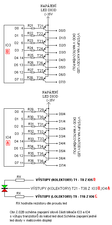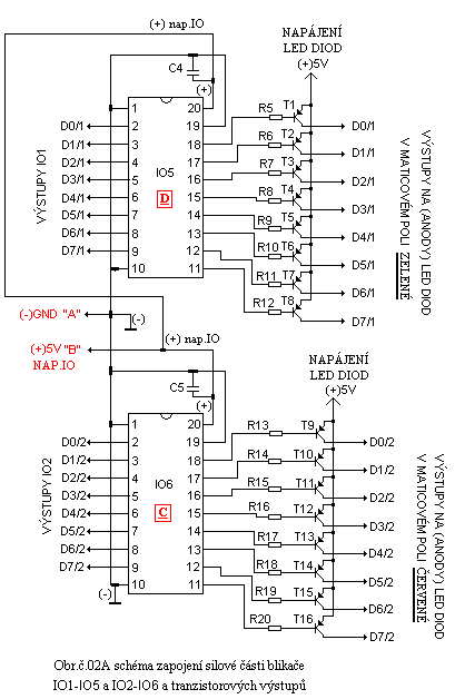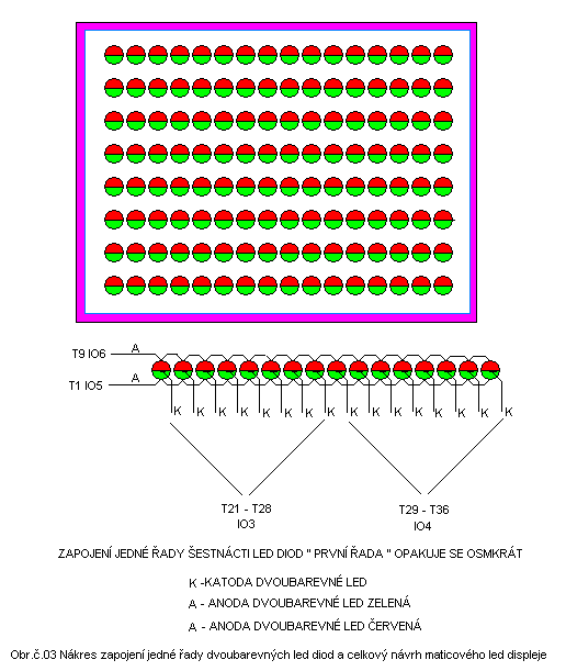 Zapojení přípravku je na obrázcích 1A,1B,2A,2B a Obr.č.03,na obrázcích 1A,1B je schéma propojení posuvných registrů,na obrázku 2A je schéma zapojení integrovaných obvodů IO5,IO6 co jsou osmibitové invertory které spínají báze tranzistorů T1 až T16,tranzistory T1 až T8 spínají zelené anody dvoubarevných led diod,tranzistory T9 až T16 spínají červené anody dvoubarevných led diod rezistory zapojené v anodách označené RX volíme dle proudu použitých dvoubarevných led diod při výpočtu volíme nižší provozní proud než je uvedený katalogový MAXIMÁLNÍ PROUD v případě že zvolíme pouze jeden rezistor RX ten zapojíme do KATODY jeho hodnotu si vypočítáme dle proudu dvoubarevné led diody a katalogového MAXIMÁLNÍHO PROUDU.Na obrázku 2B je zapojení tranzistorů T21 až T36 uvedené tranzistory spínají katody dvoubarevných led diod,na obrázku č.03A je vlastní nákres maticového displeje z dvoubarevných led diod o celkovém počtu 128 kusů a zapojení jedné řady dvoubarevných led.Je možné zvolit jednobarevné led diody a tak zvýšit počet na 256 kusů.Napájení Integrovaných obvodů IO1,IO2,IO3,IO4,IO5,IO6 převodníku je stabilizováno na napětí 5V integrovaným obvodem IO7.Napájení maticového displeje je pro větší proudový odběr ze zdroje o napětí 5V a proudu 4A.Při použití dvou zdrojů propojíme tyto zdroje na záporných svorkách (-).