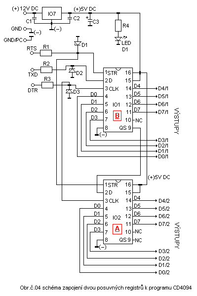 Program pro ovládání dvou posuvných registrů je zde pouze jako ukázkový společně se souborem CD4094.PAS pro inspiraci při psaní vlastních ovládacích programů.Program může být použit přímo i pro ovládání různých přípravků.Po volbě portu ten volíme stejně jako u programů popsaných výše se na monitoru zobrazí zadej hodnotu za „ A „ zde zadáváme hodnotu od 0 do MAXIMÁLNĚ 255 po zadání hodnoty stiskneme klávesu ENTER.Dále se zobrazí zadej hodnotu za „ B „ zde platí stejné hodnoty tj. od 0 do MAXIMÁLNĚ 255 po zadání hodnoty stiskneme klávesu ENTER a počítač zadané hodnoty pošle do posuvných registrů.Nové zadání hodnot je možné po stisku klávesy MEZERNÍK ukončení programu je klávesou ESC.Zdrojový soubor je velice jednoduchý a je možné ho napsat více způsoby to záleží na uživateli který způsob si zvolí pokud si bude psát program sám,osobně jsem zvolil tento snad nejjednodušší způsob napsání programu na ovládání uvedených registrů počítačem.Současně je zde použita unita FDELAY tato byla ke stažení na stránkách firmy Borland pro umožnění spouštění exe souborů na počítačích s rychlejšími procesory nad 200Mhz.Pro ty kdož chtějí používat program na uvedených procesorech nad 200Mhz je možné použít i soubor TPPATCH který překonvertuje již hotový soubor EXE.Zapojení dvou registrů je na Obr.č.04.