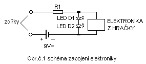 Před demontáží (rozebráním hračky) je vhodné si zjistit jaké napětí se používalo na napájení elektroniky v mém případě měla elektronika napájení 3V,z důvodu snadné výměny baterie jsem zvolil napájecí napětí 9V tedy destičkovou baterii.Při propojení zdířek prozváněným vodičem (vodiči) je protékající proud uzavřeným obvodem pomocí rezistoru R1 omezen přibližně na 0.009A napětí na led diodách je 4.6V,led diody jsou zapojeny do série.Zapojení je na Obr.č.1,hodnota rezistoru je orientační a bude se měnit dle odběru použité elektroniky z hračky,v případě že bude použita pouze optická signalizace pomocí led diod hodnotu rezistoru počítáme na napětí dle napětí led diod a jejich proudu tento volíme vždy o něco nižší než je maximální proud led diod .Výpočet rezistoru je jednoduchý : 9V – 4.4V(2.2V+2.2V) = 4.6V,výsledek 4.6V / (0.002A + 0.007A(odběr elektroniky z hračky)= 511 Ohmů