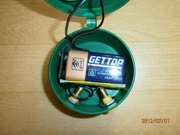 Použité součástky : Rezistor R1…500 Ohmů, led diody D1,D2…2.2V / 0.002A průměr 3 mm,konektor pro destičkovou baterii(použit ze staré 9V baterie),zdířka …2 Ks.