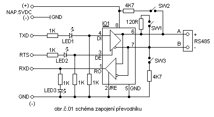 Schéma zapojení je na obrázku č.01 srdcem přípravku j integrovaný obvod SN75176 určený pro komunikaci RS232 – RS485,napájení přípravku je napětím 5VDC vstupní signály počítače TXD,RTS jsou připojeny na rezistory 1K dále pak na anody led diody D1,D2 katody led diod jsou připojeny na vstupy IO1.Na katody led D1,D2 jsou dále připojeny na rezistory 1K které jsou připojeny na záporný pól napájení (-)GND.Výstup TXD je připojen na pin IO1 č.4 DI,výstup RTS je připojen na pin č.3 DE.Pin č.1 RO IO1 je připojen na vstup počítače RXD současně je z tohoto výstupu provedena signalizace komunikace pomocí rezistoru 1K a led diody D3.Výstupní linka 485 je opatřena rezistory které se pomocí spínačů SW1,SW2,SW3 připojují na linku rezistor 120R se spínačem SW1 připojí mezi výstup „ A „ a „ B „ jde o zakončovací rezistor který musí být na obou koncích vedení RS485.Rezistory 4K7 připojené na spínače SW2 a SW3 při delším vedení určují výchozí stav linky a je nutné jejich odzkoušení připojení dle konkrétní situace.Uvedené zapojení vychází z [1] které bylo upraveno dle schématu na obrázku č.01 popis komunikace po lince RS485 je možné nalézt v [2] nebo [3] a na internetu.