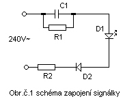 240V~.Kondenzátor je připojen na anodu led diody D1 katoda led diody je