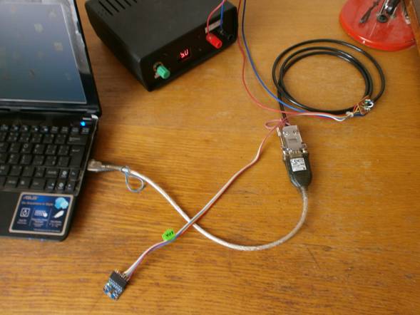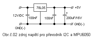 Přípravek pro komunikaci I2C jehož zapojení je na obrázku č.01 je napájen zdrojem napětí 5V schéma zapojení zdroje napájecího napětí je na obrázku č.02, jako zdroj napětí 5V je použit stabilizátor 78L05 vstupní napětí je možné v rozsahu 8 – 12VDC. Uvedené zapojení převodníku I2C používám pro všechny moduly které využívají komunikační sběrnici I2C, pro použití uvedeného modulu s čipem MPU6050 byl vyroben převodník s napětím 3.3V na straně I2C pro linky SDA a SCL. Napětí z výstupních linek DTR, RTS počítače stabilizují použité ZENEROVY DIODY 3V3 na napětí 3.3V z důvodu že čip MPU6050 na modulu používá napájecí napětí 3.3V. Počítač pro převodník I2C využívá výstupní signály RTS – (SCL), DTR – (SDA) a pro načítání hodnot z linky I2C využívá vstupní linku CTS. Logické úrovně při vysílání modulu MPU6050 na lince I2C SDA ovládají bázi tranzistoru a tento pak na vstupní linku CTS přivádí logické úrovně napětí „H“, „L“, které jsou již zpracovávány v počítači programem.
