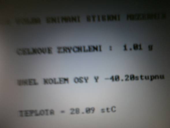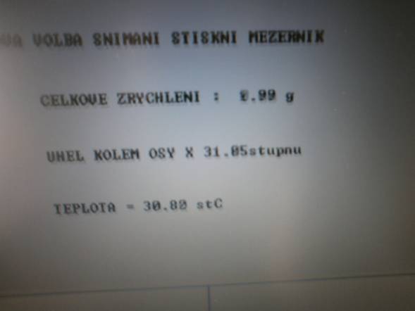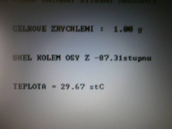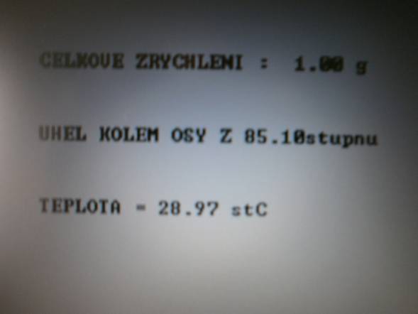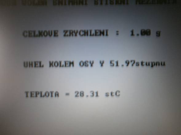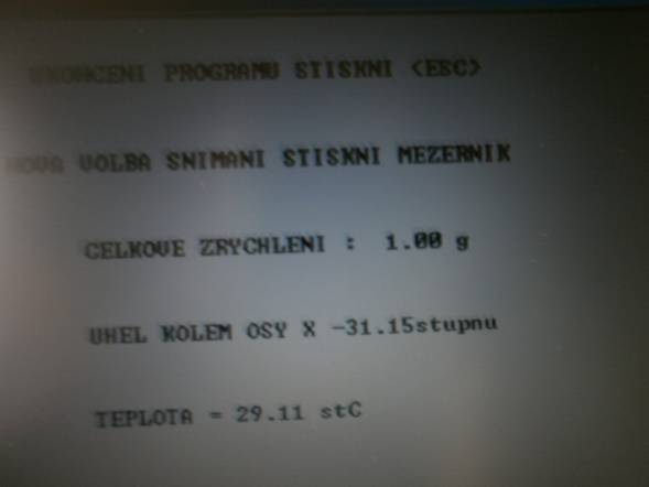Popis programu UHEL.EXE program načítá hodnoty registrů AKCELEROMETRU které přepočítá na stupně a zobrazí na monitoru současně načítá hodnoty registrů teploty TEMP_OUT_H + TEMP-OUT_L a ze součtu vypočítá teplotu. Zobrazená teplota na monitoru je teplota čipu při přiložení palce „OPATRNĚ“ na čip, se na monitoru začne zobrazovat teplota která se zvyšuje při teplotě 33°C ukončíme ohřev čipu palcem!.