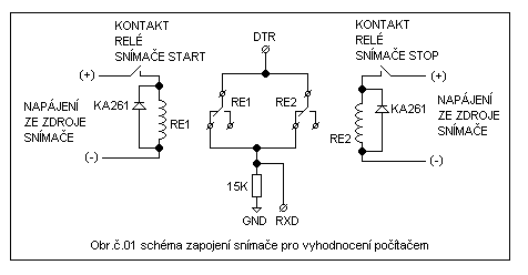 Přípravek využívá vstupního signálu z laserové závory na startu daného úseku a z laserové závory na konci měřeného úseku. Vstupní signál je vlastně kladné napětí ze zdroje který současně napájí jak laserovou závoru na startu a na konci měřeného úseku, to znamená že laserová závora jak na startu tak na konci měřeného úseku pokud není přerušený paprsek sepne relé. Toto sepnutí relé musí být dodrženo vlastní laserová závora z důvodu ceny a podmínky volby sepnutí relé při nepřerušeném paprsku byla zvolena z nabídky GME nevýhodou je že přijímač a vysílač sestavy jsou samostatné desky. Tímto je nutné po namontování vysílače a přijímače na nosné stojany tyto propojit kabelem nebo je umístit společně na jeden stojan a na druhý stojan umístit zrcátko, pro odraz paprsku na přijímač volba a výroba snímačů pro měřený úsek je čistě individuální záležitost. Při trénincích na hřišti v běhu na čas a použití dvou samostatných stojanů pro vysílač a přijímač je možné kabel mezi vysílačem a přijímačem vést po zemi tak aby netvořil překážku závodníkovi. Při trénincích na ledě je výhodnější namontovat vysílač i přijímač na jeden stojan a na druhém stojanu umístit již zmiňované zrcátko pro odraz paprsku na přijímač. Napájení uvedených závor je možné z bezúdržbových akumulátorů 12VDC napětí 12VDC je pro použitý typ dáno výrobcem, nebo pomocí zdroje ze sítě 240VAC kdy je použit adaptér 240V/12V toto je čistě individuální věc za dodržení bezpečnostních podmínek. Počítač je taktéž možné napájet pouze z baterie (notebook) nebo také ze sítě 240VAC za stejných podmínek jako při napájení závor. Vstupní signál (opět kladné napětí) do počítače je získán z výstupu DTR počítače PC, toto napětí výstupu DTR je využito jako vstupního signálu pro spuštění a zastavení stopek pomocí vstupu RXD. Využitím výstupu DTR a použitím relátek RE1, RE je docíleno že obě napětí jsou od sebe oddělena a nemůže dojít k poškození PC. Po zapnutí napájení laserových závor dojde k sepnutí relátek v závorách jejichž pracovní kontakty sepnou relátka na přípravku RE1 a RE2, tím je sestava připravena na odpočet. Po spuštění programu a zadání jména je již automaticky program připraven po přerušení paprsků ve startovní závoře spustit odpočet času. Po proběhnutí závodníka cílovou závorou je automaticky odečten čas a tento je zobrazen na monitoru PC současně je zapsán i do souboru, nyní po stisku klávesy MEZERNÍK je možné zadat další jméno závodníka a celý cyklus se opakuje stejně. V případě že po proběhnutí závodníka již další závodník není nebo chceme program ukončit stiskneme klávesu ESC a program se ukončí. Schéma zapojení přípravku je na obrázku č.01, na obrázku č.02 je jednoduchý přípravek pro odzkoušení programu zda funguje s použitým PC. Vzdálenost každé závory od stanoviště s PC je odzkoušena do vzdálenosti 60m, v případě že stanoviště je ve stejné linii jako závory je vzdálenost závor více jak 100m. Výroba nebo použití hotových modulů laserových závor je také čistě individuální věc je pouze nutné pro používání s tímto přípravkem a programem dodržet to aby při nepřerušení paprsku byl aktivní výstup závor, tzv. bylo umožněno sepnutí relátek RE1 a RE2 v přípravku. Oproti programům časomíra pro hasiče, časomíra které jsou na tomto webu tento přípravek a program využívá pro spuštění a zastavení stopek jeden vstup a to RXD. Po přerušení paprsku závory dojde na určitý čas 0.8s údaj výrobce k vypnutí relé v závoře, tím odpadne i relé které je napájeno závorou u které došlo k přerušení paprsku a tím se přivede kladné napětí výstupu z DTR na vstup RXD a dojde k vyhodnocení počítačem. Použitá relátka musí mít napájecí napětí cívek stejné jako je napájení laserových závor.