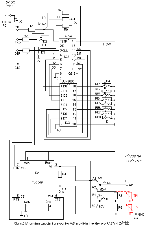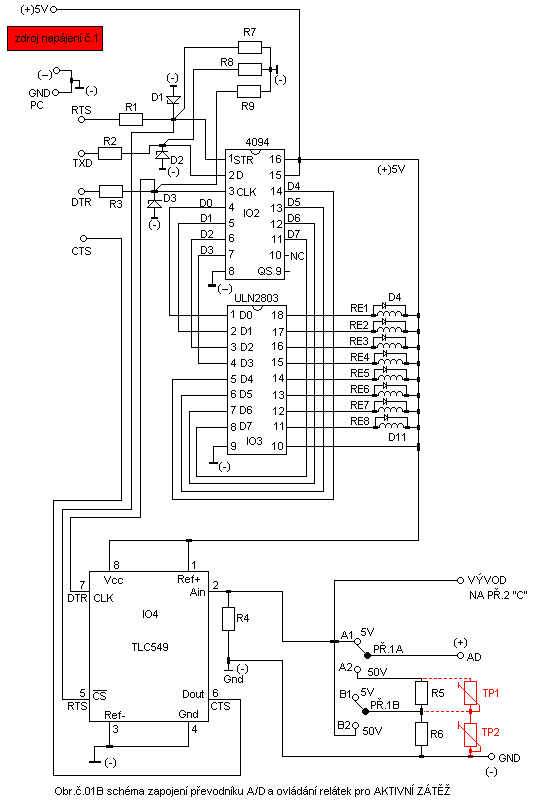 IO2….4094 , IO3….ULN2803 , IO4…..TLC549 , + PATICE PRO VŠECHNY IO, RELÉ RE1 – RE8 ….CÍVKA 5V 2 * PŘEPÍNACÍ KONTAKT PROUD 1.2A MINIMÁLNĚ . 1 KS ZDÍŘKA ČERNÁ , 6 KS ZDÍŘKA ČERVENÁ , konektor propojení modulu / počítač + kabel na propojení počítače s modulem pětižilový.