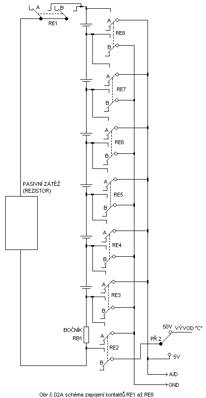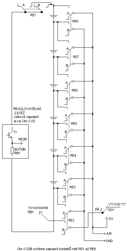 Modul může být vyroben ve variantě s pasivní nebo s regulovanou zátěží.Ti kdož používají stále stejné baterie a napětí jednotlivých článků sestavené baterie NEPŘESÁHNE NAPĚTÍ 5V si mohou vyrobit modul kde nebudou použity přepínače pro volbu napětí a proudu,dále může být na vybíjení použit místo regulovatelné zátěže rezistor,při této volbě zátěže je však modul jednoúčelový pro tuto verzi byl upraven zdroj pro externí napájení 12VDC v terénu.Vybíjené baterie se připojují k modulu pomocí zdířek výroba držáku baterií je čistě individuální věc podle používaných baterií.Osobně při vybíjení proudem do 0.5A používám tovární klec na tužkové baterie která je osazena vývody na jednotlivých bateriích.Pokud je modul vyrobený tak že umožňuje volbu napětí i proudu je možné vybíjet baterie do napětí MAXIMÁLNĚ 50V DC,vybíjecí proud je omezen dle varianty modulu vybíjecím rezistorem jeho wattovou zátěží a wattovou zátěží bočníku použitými relátky (proudem kontaktů).Ve variantě s regulací proudu pak použitým tranzistorem použitými relátky (proudem kontaktů) a wattovou zátěží bočníku.V případě použitých součástek dle schématu je MAXIMÁLNÍ VYBÍJECÍ PROUD 1.5A ten dán proudem kontaktů použitých relátek, tento proud pokud je brán jako 1/10 kapacity článku odpovídá celkové kapacitě článku 15Ah.Napájení modulu je 5V toto napětí je po usměrnění diodovými můstky získáno ze stabilizátorů 7805 na jejich vstupy jsou po úpravě zapojení připojeny i diody ze zdířek pro připojení externího napájení 12VDC z automobilové baterie.Ve variantě kde je použit vybíjecí rezistor je použit transformátorek s jedním sekundárním vinutím ve variantě s regulací proudu je použit transformátorek s dvěmi vynutími a zdroj je dvojitý.Napájecí zdroj je na primární straně chráněn pojistkou,na snímání napětí vybíjené nebo vybíjených baterií a proudu je využit osmibitový A/D převodník TLC549 přepínání relátek a tím i snímání napětí na jednotlivých baterií a celkového vybíjecího proudu je využit osmibitový posuvný registr 4094.Cívky relátek jsou spínány obvodem ULN2803 tento je ovládán výstupy z posuvného registru,rozlišení napětí A/D převodníku je dáno referenčním napětím 5V a je 0.02V,je možné si při vlastní tvorbě programu provést úpravu na rozlišení 0.01V tím že referenční napětí zvolíme 2.5V.Na bočník pro snímání proudu je použit rezistor 1R/17W tím je dán úbytek napětí který je roven vybíjecímu proudu,snímané napětí na bočníku je na vstup A/D převodníku připojeno přes přepínač PŘ.2 tento přepínáme dle vstupního napětí vybíjených baterií přepínáme do polohy 5V nebo 50V z toho přepínače je naměřené napětí na bočníku připojeno přímo na vstup A/D převodníku pokud je sepnuto relé RE2.Snímané napětí je z relátek RE3 až RE8 vedeno na přepínač PŘ.1 kde volíme rozsah napětí 5V nebo 50V dle vybíjených baterií počet baterií může být od jedné až po celkový počet šesti baterií pokud je vybíjeno méně jak šest baterií je nutné z poslední zdířky kde je připojena poslední vybíjená baterie provést propojení na poslední zdířku,tím je zaručeno to že je uzavřen vybíjecí okruh a relé RE1 po sepnutí provede připojení podle varianty buď vybíjecí rezistor nebo tranzistor pokud je použito varianty regulace proudu.Pokud by se toto propojení neprovedlo budeme pouze měřit baterie a nebudeme vybíjet ze zapojení to je zřejmé.Vybíjecí část je tvořena samostatným napájením potenciometrem a tranzistorem společně s bočníkem tento slouží zároveň jako vybíjecí rezistor.Bočník na měření napětí vyššího jak 5V je tvořen napěťovým děličem R5,R6 místo těchto rezistorů je možné použít víceotáčkové trimry a nastavit tím hodnoty přesně,zvolené hodnoty R5,R6 nijak nezatěžují testované baterie.Schéma zapojení modulu s pasivním vybíjením (rezistorem)je na obrázcích Obr.č.01A , Obr.č.02A , Obr.č.04A,zapojení modulu s nastavitelným proudem je na obrázcích Obr.č.01B , Obr.č.02B , Obr.č.03 , Obr.č.04B.
