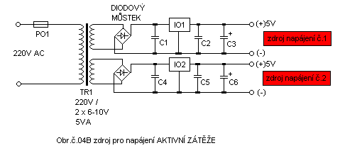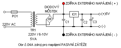 1 * pojistkový držák , transformátor220V/ 6-10V 5VA, diodový můstek , C1,C2 ….100nF keramika , C3…elektrolytický kondenzátor 2200uF/16V, stabilizátor IO1 ….7805 .zdířka červená 1Ks,