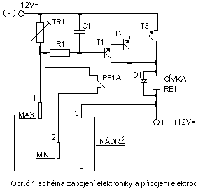 Na relé RE2 je použit kontakt RE2B na bázi tranzistoru T1 je záporné napětí a tranzistory v Darlingtonově zapojení jsou uzavřeny relé RE1 je bez proudu. Kontakt RE2B je sepnutý a čerpadlo doplňuje kapalinu do nádrže. Hladina v nádrži neustále stoupá, až dosáhne k elektrodě 2 tato je zapojena na klidový kontakt RE1A který je rozpojený nic se neděje, hladina stoupá dál až k elektrodě 1 v tu chvíli se na bázi tranzistoru T1 dostane kladné napětí které sepne tranzistory v Darlingtonově zapojení tyto sepnou cívku relé RE1 a kontakty RE1A a RE1B. Kontakt RE1B sepne cívku relé RE2 a ta rozepne kontakt RE2B tím se rozpojí napájení čerpadla a ukončí se doplňování kapaliny do nádrže.
