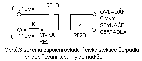 RE1B. Kontakt RE1B sepne cívku relé RE2 a ta kontaktem RE2A spustí čerpadlo, nyní