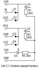 Schéma zapojení přípravku je na obrázku č.1 zapojení je jednoduché rezistory R1 až R3 omezují procházející proud led diodami D1 až D3 a zároveň i proud odebíraný z výstupních signálů testovaného portu na hodnotu 0.006A tím to nejsou výstupní linky zatěžovány velkým proudem.Spínače S1 až S4 spínají výstupy testovaného sériového portu se vstupy testovaného sériového portu a stavy na jednotlivých vstupech vyhodnocuje program.