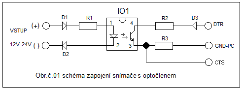Popis k obr.č.01 kladné napětí signálu je přivedeno na rezistor R1 tento omezuje protékající proud do diody v optočlenu IO1 rezistor je připojen na anodu diody D1 která propustí pouze kladnou hodnotu signálu na anodu diody v optočlenu IO1,záporný signál je přiveden na diodu D2 z této je přivedeno na katodu diody v optočlenu IO1. Kladné napětí z výstupu DTR je přivedeno na anodu diody D3 a na rezistor R2,který je připojen na kolektor tranzistoru v optočlenu IO1.Emitor tranzistoru v optočlenu IO1 je připojen na rezistor R3 zde je i výstup do počítače PC na vstup CTS, druhý vývod rezistoru R3 je připojen na výstup GND počítače PC. Rezistory R2 a R3 omezují proud výstupu DTR na hodnotu nepřevyšující 0.002A,současně tvoří i napěťový dělič pro vyhodnocení logického stavu na vstupu CTS.